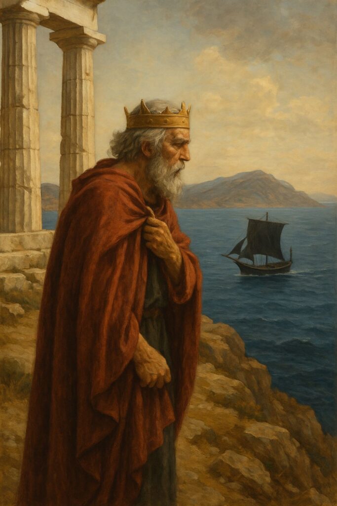 Believing his son Theseus had been killed by the Minotaur, he saw the ship returning with black sails and, overcome with grief, threw himself off the cliff into the sea below.