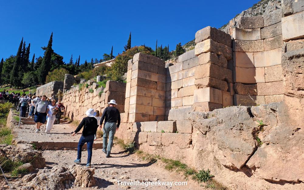 Delphi, a UNESCO site, is not wheelchair accessible as it is placed on a hillside with a steep path, rocky with some uneven stone steps.