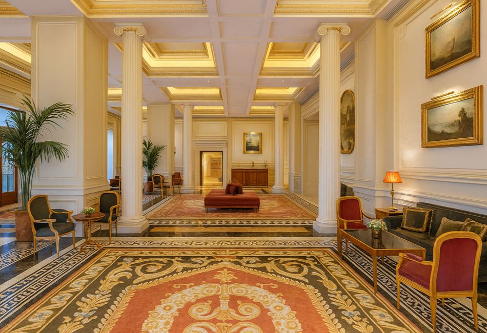 The lobby is particularly impressive, with glossy checkered floors, crown-molded ceilings, and several seating areas filled with luxurious Victorian chairs and couches.